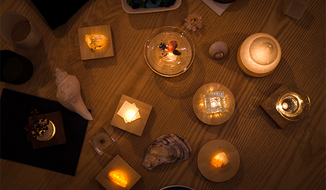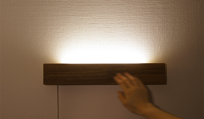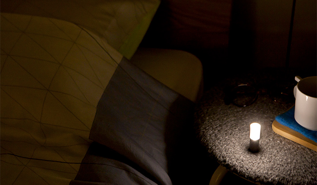 木のタッチパネルに触れて光をコントロールする間接照明「jiwari-moonlight」、充電電池を内蔵し設置場所を選ばない常夜灯「CALM」は、それぞれグッドデザイン賞を受賞。